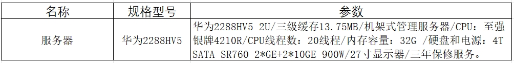 商品名称:华为2288HV5 2U/三级缓存13.75MB/机架式管理服务器/CPU:至强银牌4210R/CPU线程数:20线程/内存容量:32G /硬盘和电源:4T SATA SR760 2*GE+2*10GE 900W/27寸显示器/三年保修服务