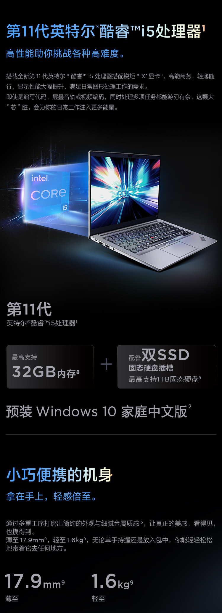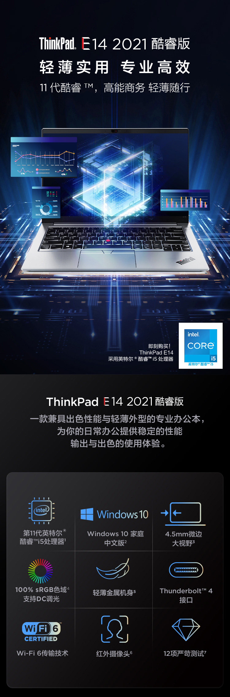 商品名称:联想ThinkPad E14 2021 居家办公本 酷睿版 英特尔酷睿i5 14英寸轻薄笔记本(i5-1135G7 16G 512G 100%sRGB)银