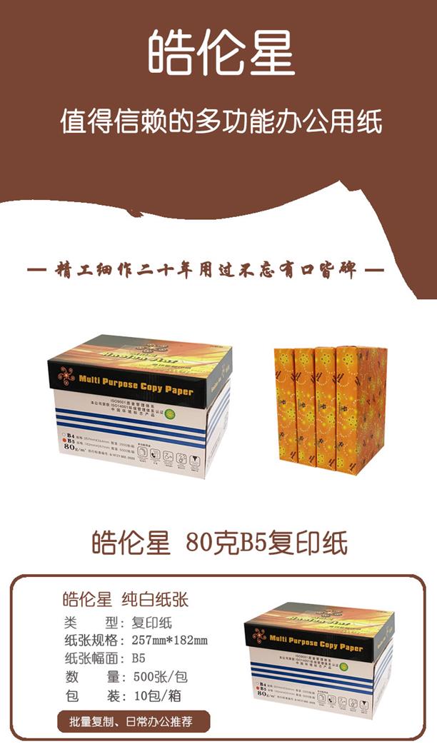 商品名称:皓伦星 80克B5 复印纸 10包/箱 500张/包(单价 元/箱)厂家直销