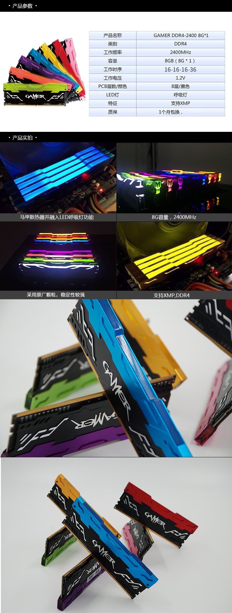 商品名称:影驰 GAMER DDR4 2400 8G 台式机内存 内存条 灯条 呼吸灯 灯光内存 绿色
