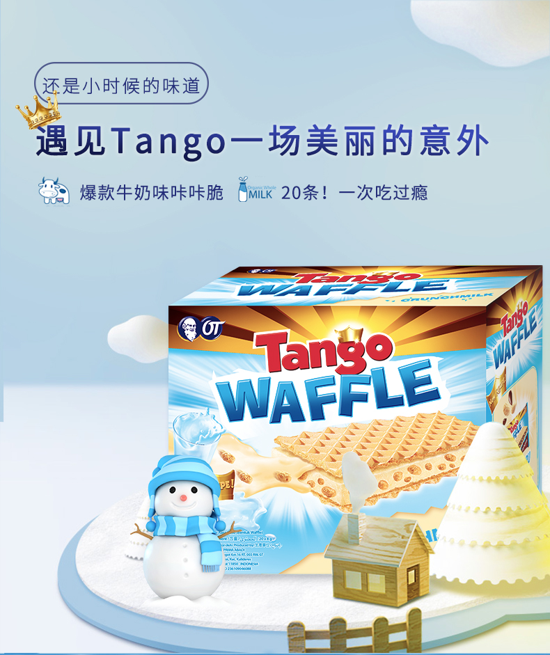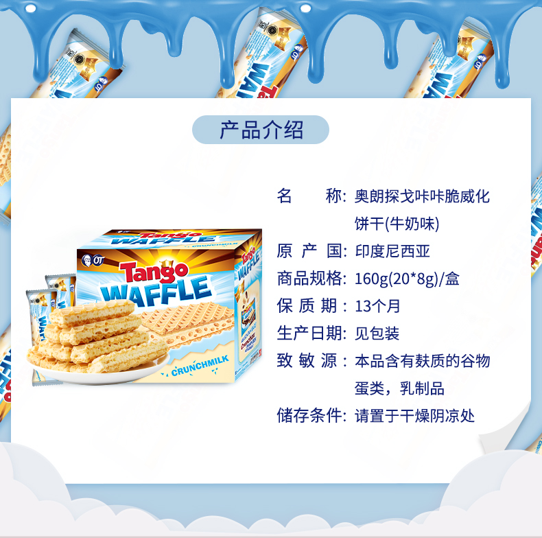 商品名称:印尼进口 Tango咔咔脆威化饼干 休闲零食小吃 早餐下午茶食品 牛奶味夹心160g/盒